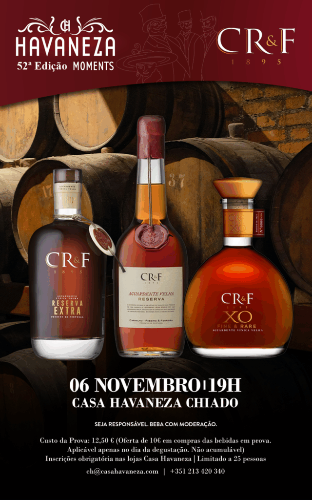 Junte-se a nós para uma noite dedicada à arte e tradição das Aguardentes CR&F — símbolo de qualidade, herança e requinte português. Uma oportunidade única para descobrir a mestria desta icónica marca nacional, reconhecida pela sua elegância e caráter excecional.